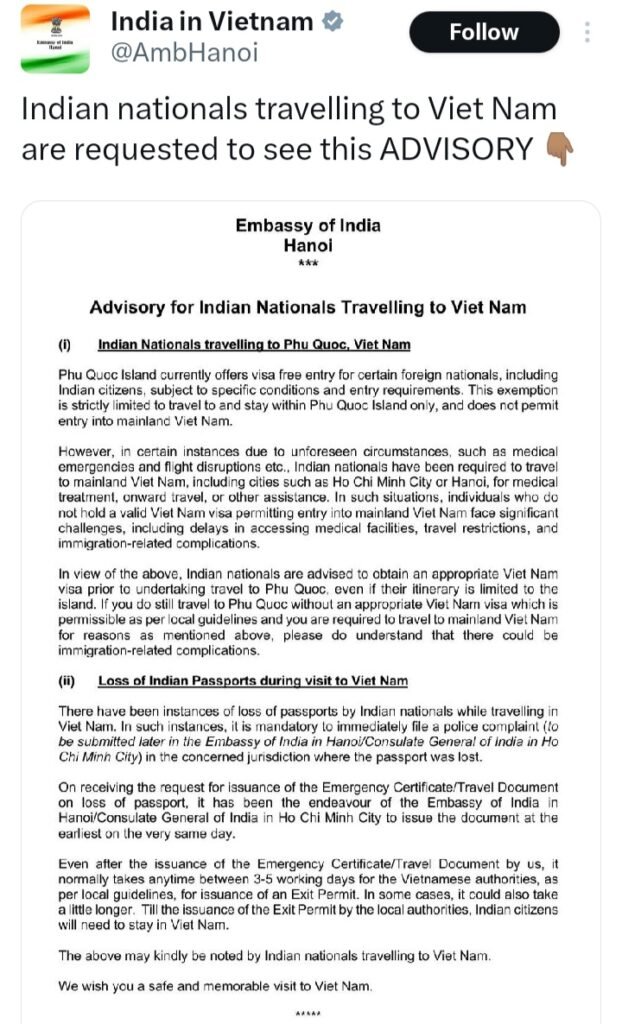 Phu Quoc has become the ultimate “Premium” destination for Indians looking for a quick escape without the paperwork. However, a new advisory from the Indian Embassy warns that “Visa-Free” does not mean “Worry-Free.” Indian tourists are being urged to exercise caution over two critical issues that could leave them stranded or facing legal hurdles.
